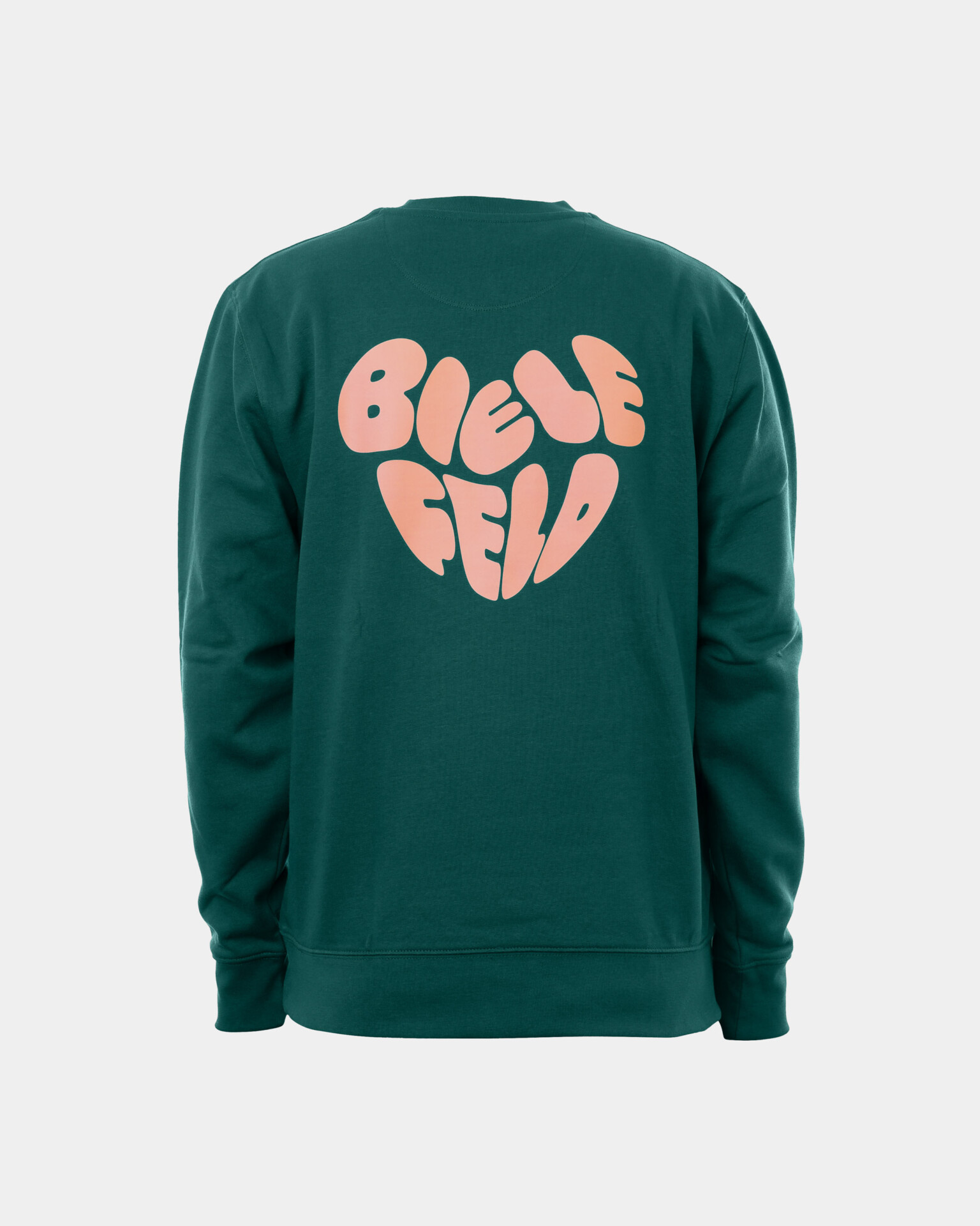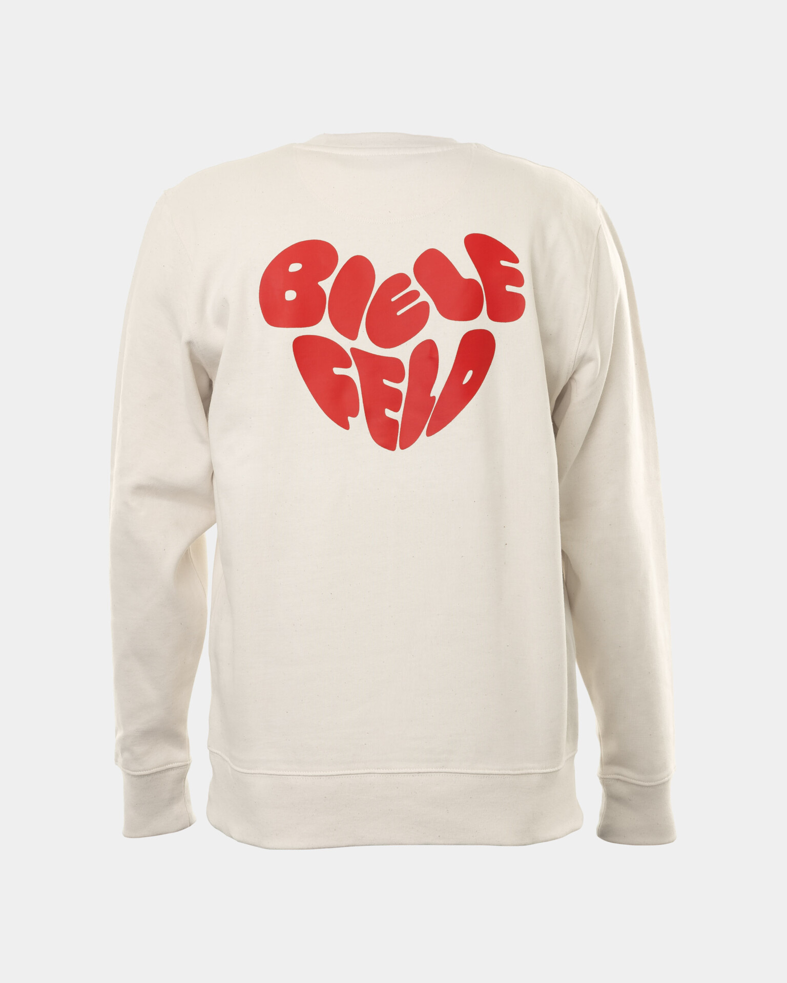 Das liebevolle Bielefeld-Sweatshirt kommt mit dem Aufdruck „BIE“ auf der Brust und dem Bielefeld-Herz auf dem Rücken. Das Shirt besteht zu 100 Prozent aus gekämmter ringgesponnener Bio-Baumwolle und ist erhältlich in den Farben natural raw/rot und glazed green/lachs. Ausführung: unisex