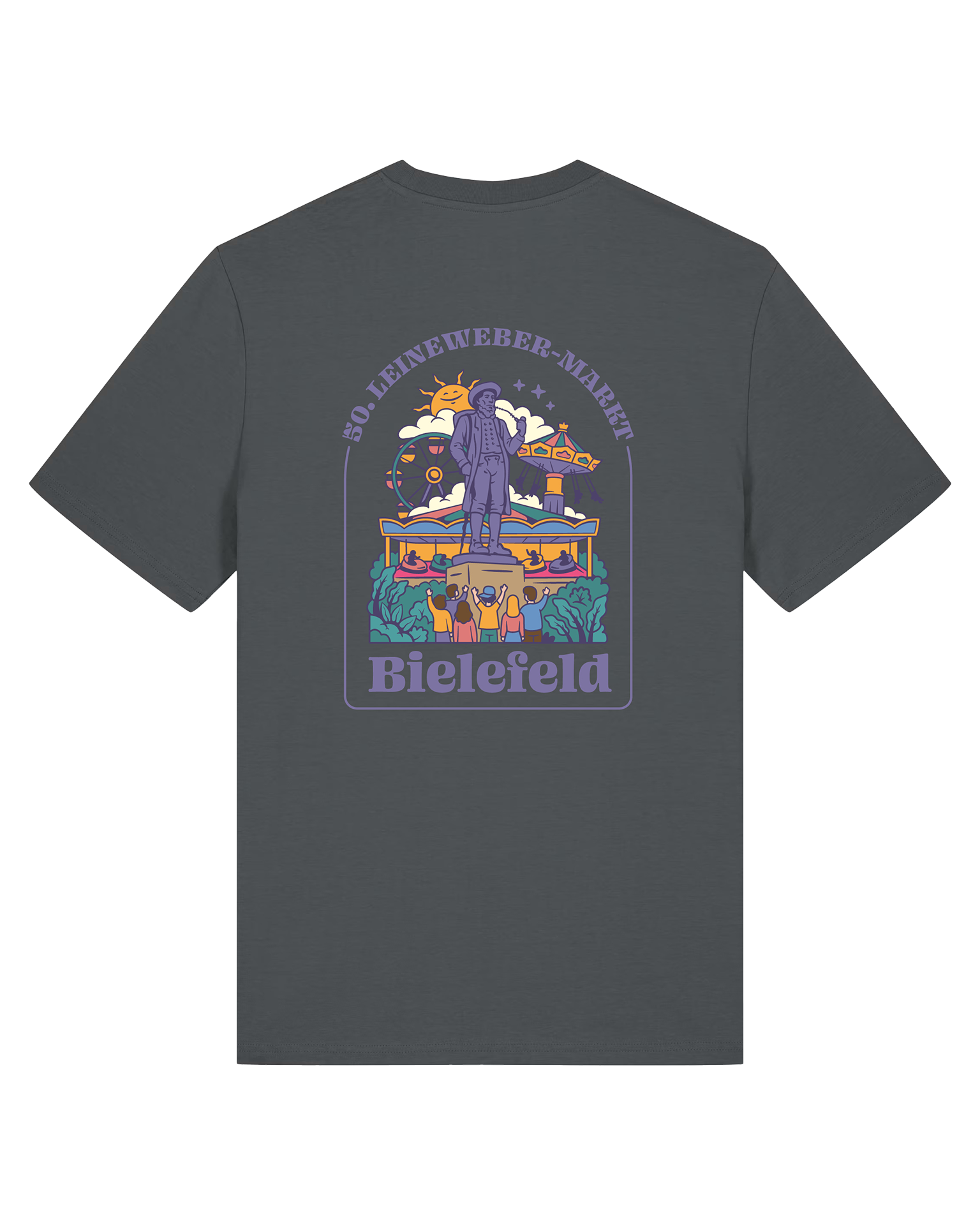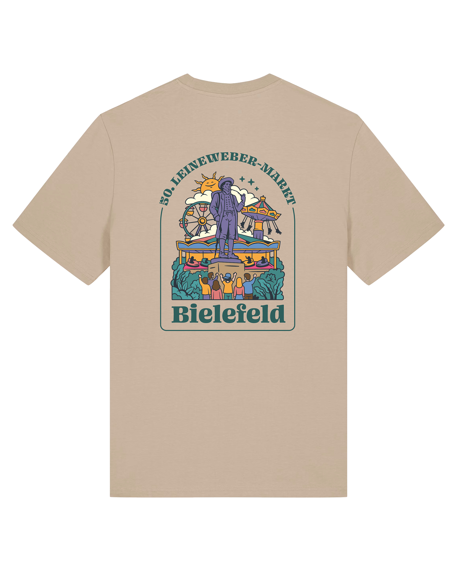 Vom 3. – 7. Juni 2026 wird der 50. Leineweber-Markt in Bielefeld gefeiert. Zu diesem Anlass gibt es dieses auf 500 Stück limitierte Retro-Shirt zum 50. Leineweber-Markt. Das Retro-Motiv ist als großflächiger Rückendruck platziert, die Vorderseite ist unbedruckt. Das T-Shirt gibt es in den Farben Desert Dust und Anthracite mit jeweils farbig angepasstem Druck.
